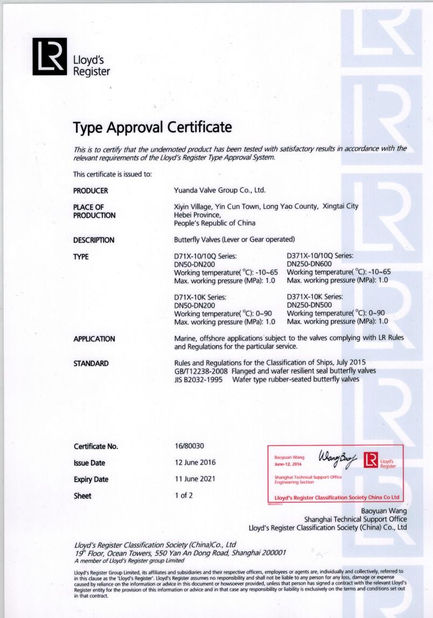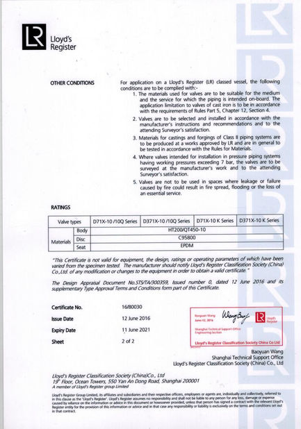 Standard:GB/T 19001-2016/ISO 9001:2015 Number:4304-2007-AQ-RGC-RvA Issue Date:2019-10-12 Expiry Date:2022-10-20 Scope/Range:Design, production and sales of general valves, valve accessories and valve castings, including gray cast iron, ball milled cast iron, steel castings and stainless steel parts. Issued By:DNV GL -Business Assurance |